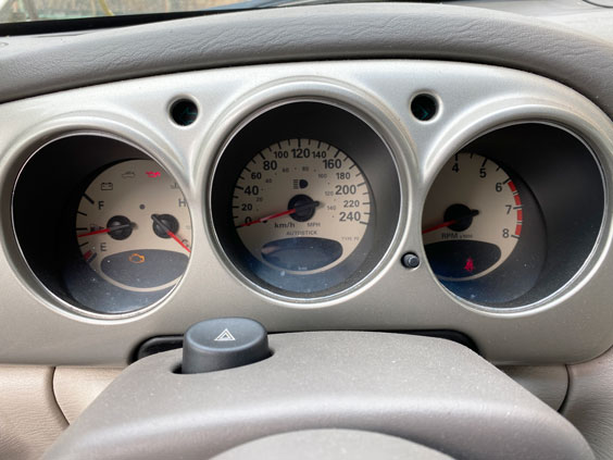 当たり前ですが、充電が足りていないので、メーター内のランプも弱弱しく点灯しています…。